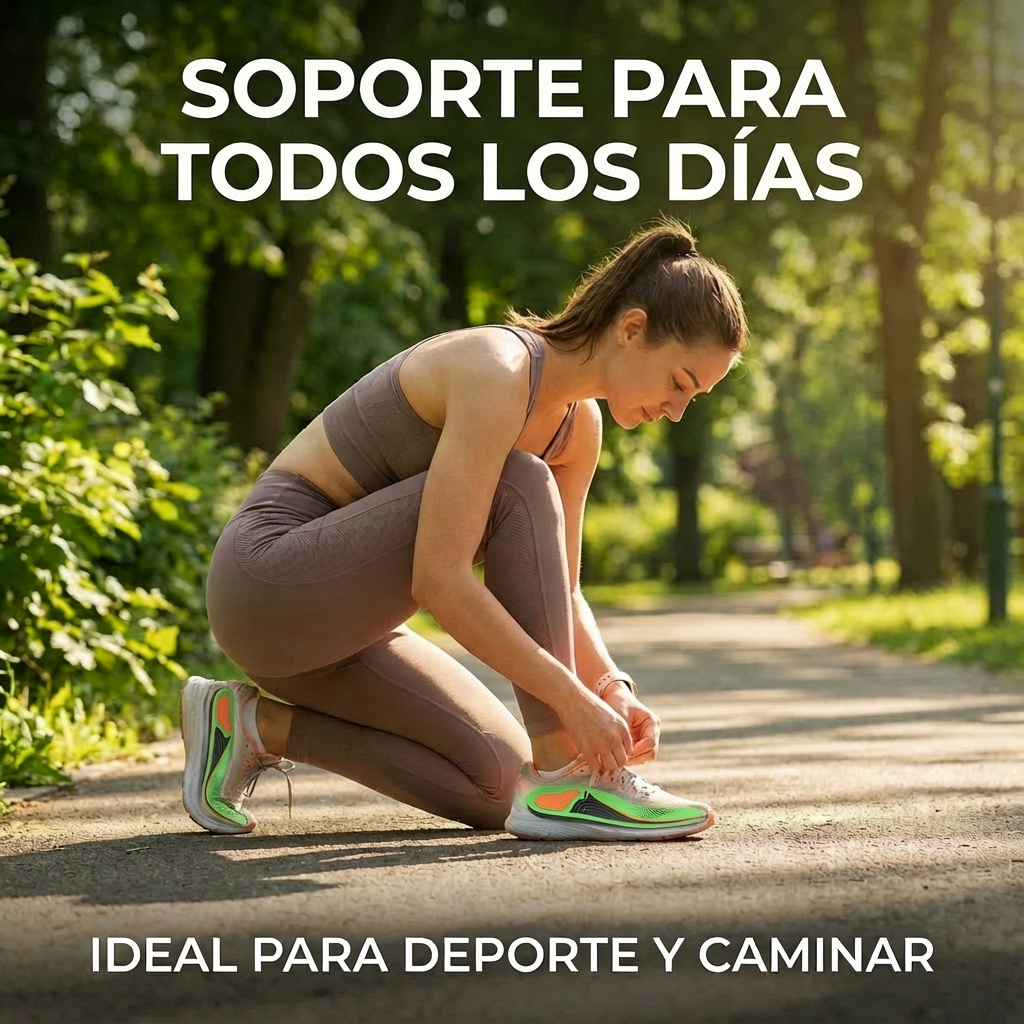 • Soporte de Arco Flexible: El chasis negro proporciona el soporte justo para corregir la pisada sin ser tan duro como las plantillas ortopédicas médicas.
