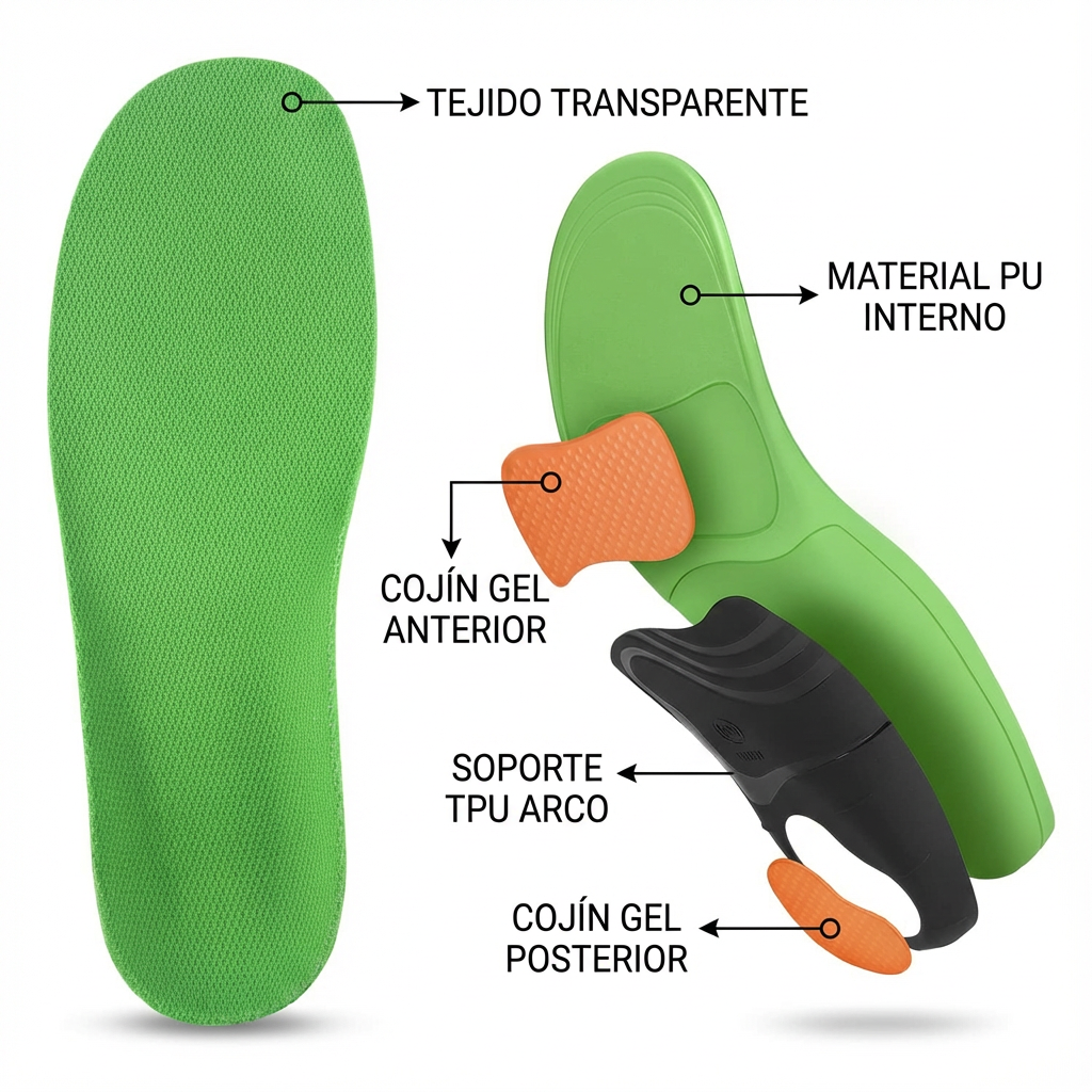 • Ventilación Lateral: A diferencia de las plantillas cerradas, este modelo cuenta con orificios en el soporte del arco que expulsan el calor y la humedad con cada paso. ¡Dile adiós al mal olor!